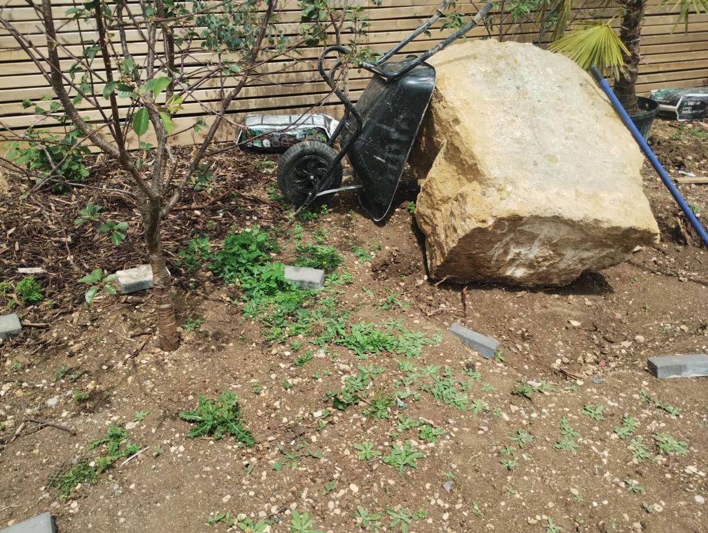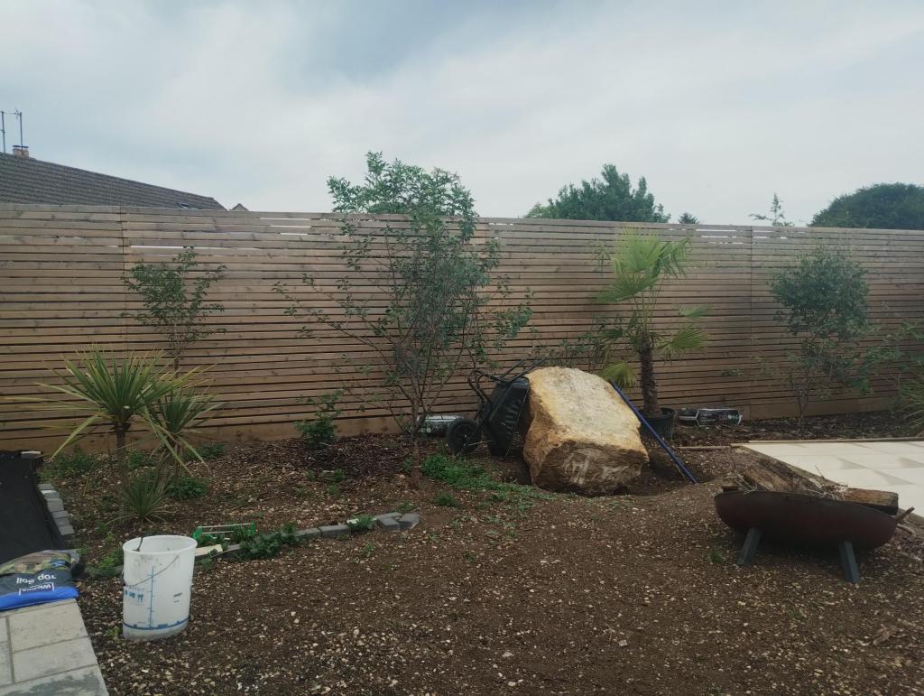 Large boulders were installed, and sunk slightly into the reconditioned top soil. Palms, Phormiums and other structural plants were added to give year round interest and an exotic feel. And finally, perennials to give summer interest and variety.